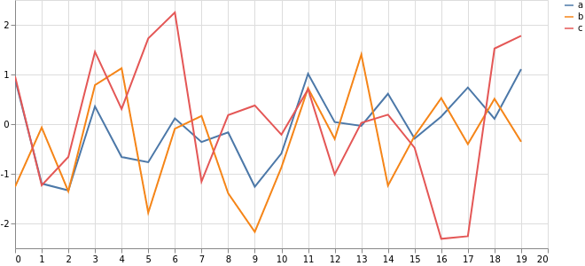 chart_data = pd.DataFrame(np.random.randn(20, 3), columns = ['a', 'b', 'c'])