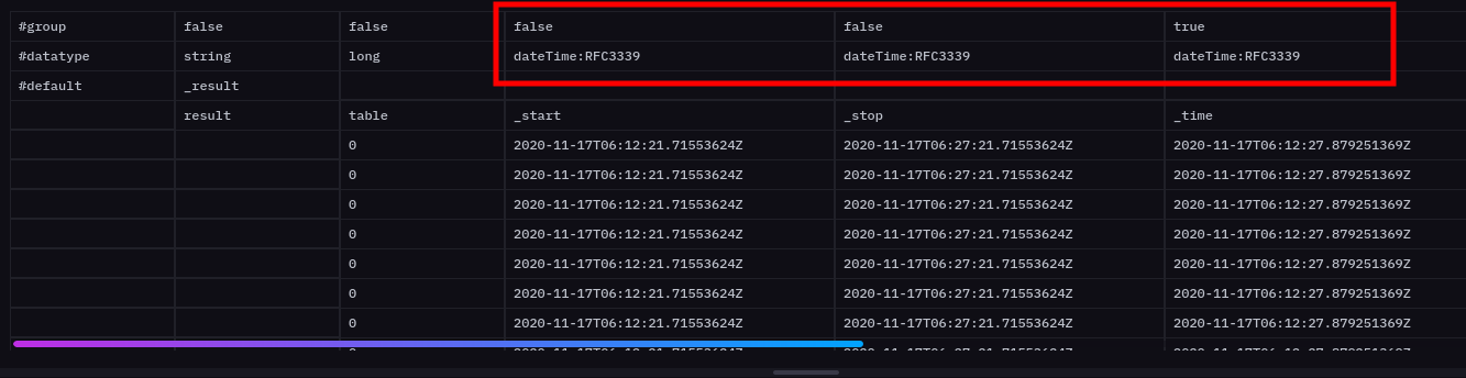 Now, with the following snippet, we group data along the _measurement and _field columns.